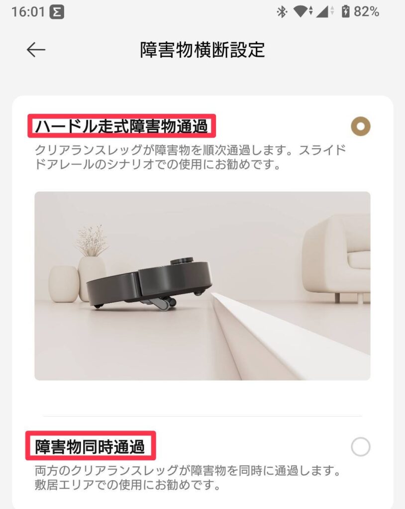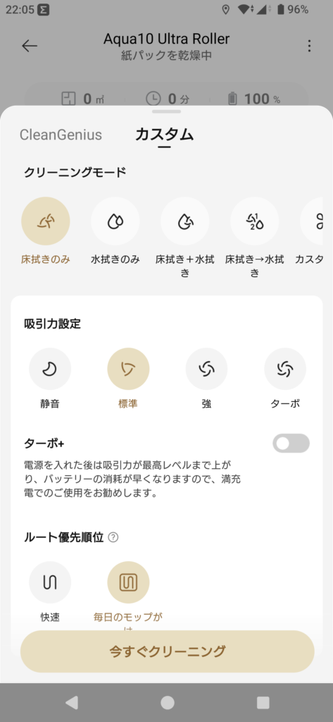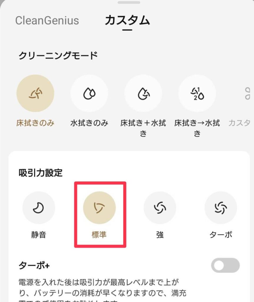 「掃除機だけ」や「モップだけ」、「掃除機とモップ同時」、「掃除機の後でモップ」などの掃除の設定や吸引力の設定などもできます😄