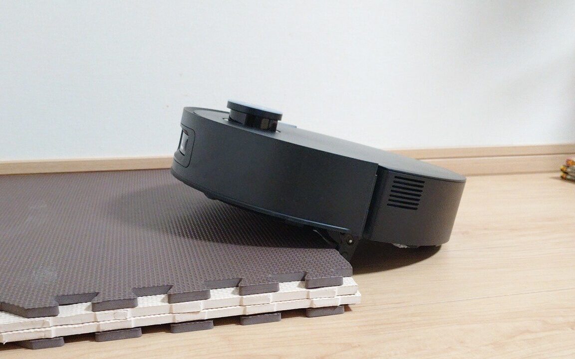 ハードル走式障害物通過で4㎝のプレイマットを簡単に乗り越えています✨足が出てきてロボット掃除機を持ち上げて乗り越えます😄