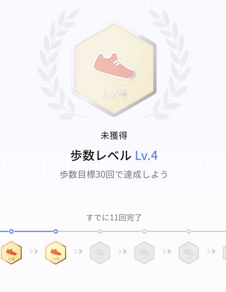 次回のレベル4の獲得には歩数目標30回の達成が必要です😄