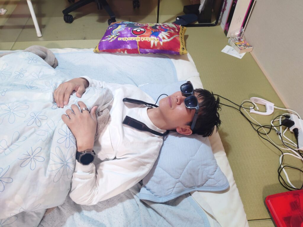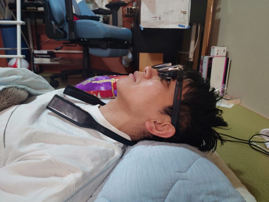 仰向けで寝たときにテンプルが枕に当たってしまいますがVITURE Luma Ultraのテンプルはそんなに長くないので仰向けでも寝ながら使えます😄