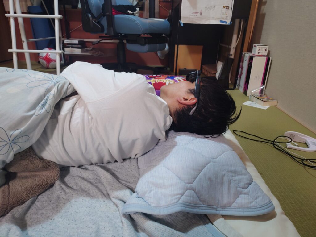 配線が右にあるので右向きでは寝れないと思いましたが、配線が耳の後ろに行くので右でも左でもどんな寝かたでも快適に使えます✨