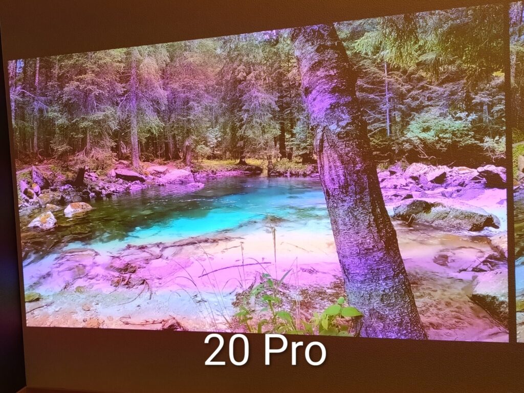照明を半分程度に落として輝度の違いの影響が出にくいようにしています✨20 Proの方が映像の色彩表現が良く立体感(物体の凹凸や奥行)なども繊細に表現することで実物と見間違えるほど😍(同じ4Kでもここまで違うのかと思いました😆)白の壁紙でこの投影映像は本当に凄い✨(途中で出てくるカメレオンの映像は有機ELDディスプレイと思うほどの綺麗さ😍)