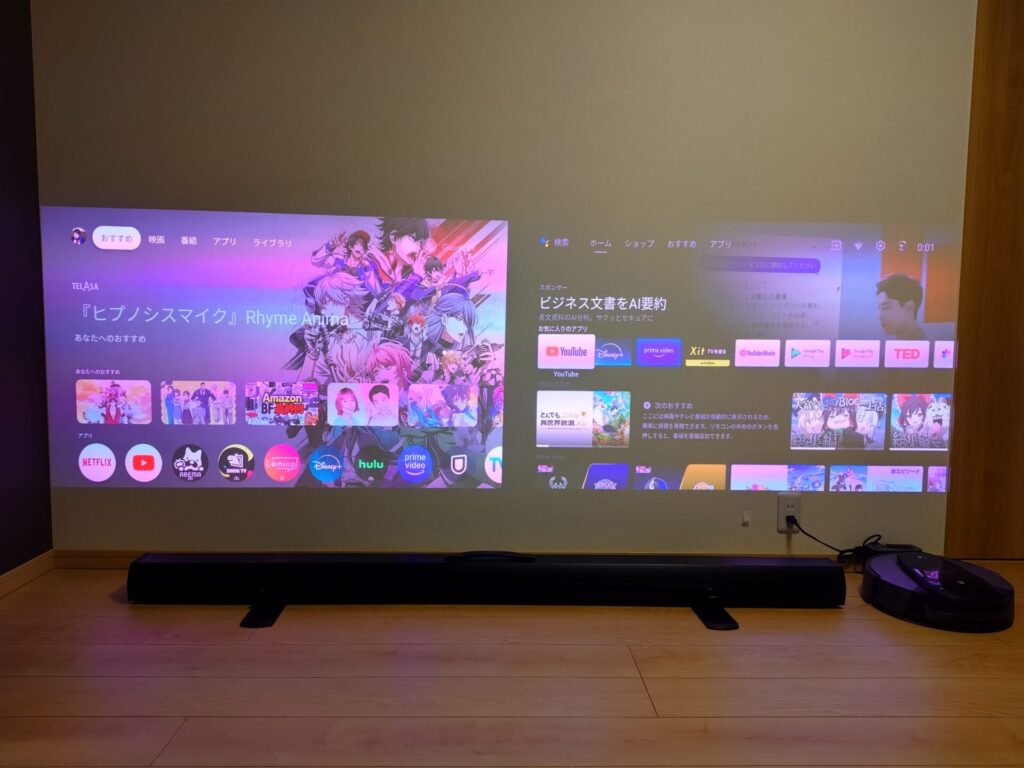 左が【20 Pro】右が【S Max】✨部屋の照明をオン・オフにして投影映像の輝度の違いを見て下さい😊照明がオフのときは輝度の違いは分かりにくいですが、オンになると【S Max】の方が映像が薄くなります。(1000ISOルーメンの違いが分かります✨)